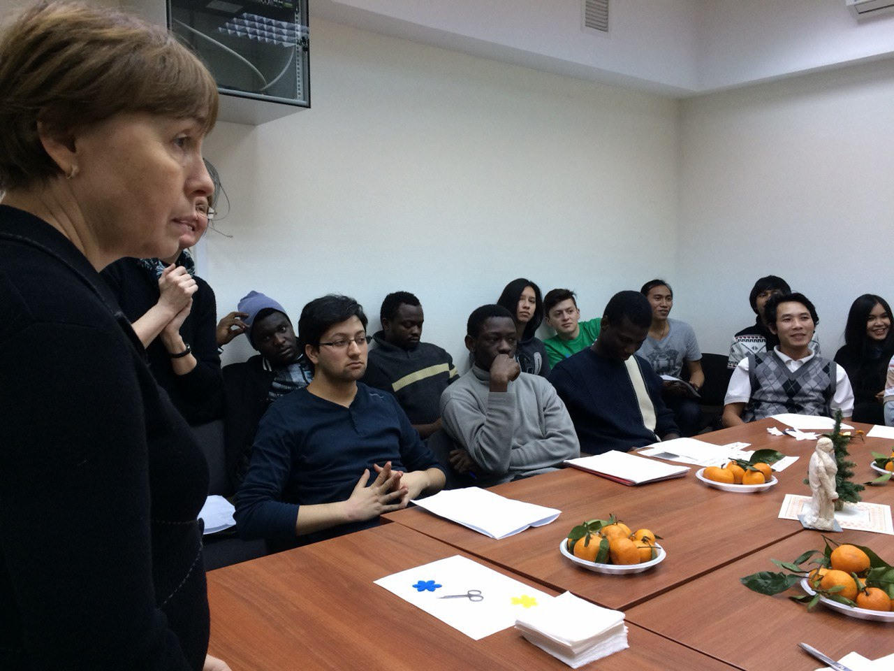 Вторая университетская история — новогодняя. Как всегда — развлечения и угощение. Педагоги предложили студентам конкурс на самую красивую снежинку, вырезанную из салфетки. И тут оказалось, что студенты вообще не понимают, чего от них хотят. Надо сказать, что это были ребята из тёплых стран, где сами снежинки — небывалое событие, а уж вырезание их из бумаги — дело совсем экзотическое. На фотографии видна озадаченность студентов, да и преподавателей тоже.