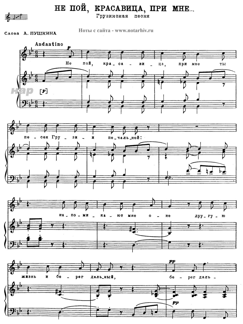 «В истории романса „Не пой, красавица, при мне“ приняли участие трое: Пушкин, Грибоедов, и Глинка. Дело было 12 июня 1828 года. Они встречались в Петербурге, в салоне Олениных — одном из самых знаменитых литературных салонов. И как-то раз Грибоедов сыграл грузинскую народную мелодию, которую слышал в Тифлисе. Песенка всем понравилась. Юная Анна Оленина напевала мелодию, а Глинка сочинил законченную фортепианную пьесу, добавив к напеву прозрачный аккомпанемент. Слушатели, однако, заметили, что к музыке не хватает слов. Один из современников вспоминал: „Глинка играл на фортепьяно грузинскую мелодию со свойственным ему выражением и искусством. На замечания присутствующих, что ей не достаёт стихов, Пушкин написал… стихотворение“.Пушкин сочинил стихи в ритм грузинской песенки. Этот тот нечастый случай, когда стихи писались под готовую мелодию. Александр Сергеевич как бы обращается к Олениной: „Не пой, красавица (изначально было — „волшебница“), при мне ты песен Грузии печальной…“. Стихи и были посвящены Анне Алексеевне, в которую, к слову, Пушкин был влюблён…»Этот романс обязательно прозвучит 20 января. А вы пока повторите стихи и ноты: